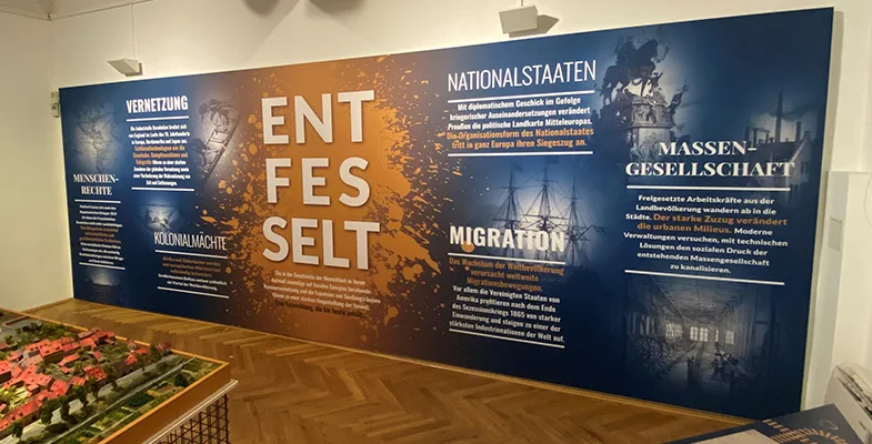 Für das Stadtmuseum Erfurt durften wir ein außergewöhnliches Projekt umsetzen: die Ausstellung „Erfurt entfesselt“. In enger Zusammenarbeit mit dem Architekturbüro Albrecht von Kirchbach entstand eine eindrucksvolle Präsentation, die durch moderne Textildrucke, hinterleuchtete Kartentische und detailreiche Ausstellungselemente Geschichte erlebbar macht.